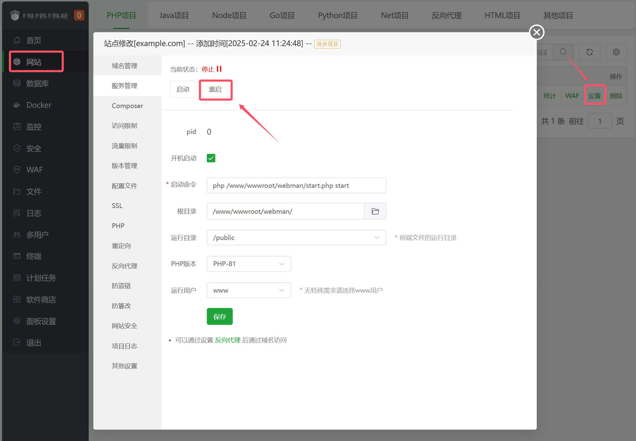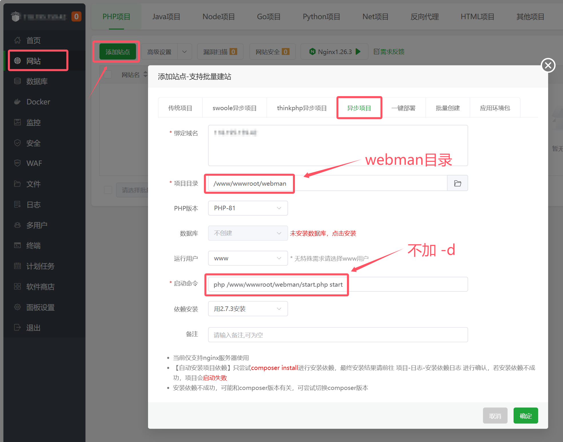 寶塔會自動守護進程,啟動命令為php /www/wwwroot/webman/start.php start,不加-d參數,否則無法啟動