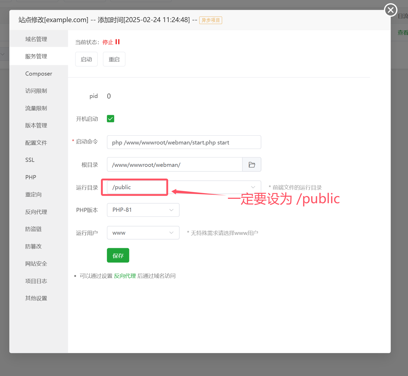 為了系統安全,運行目錄必須設置為/public,錯誤的設置可能會導致敏感文件被外網訪問